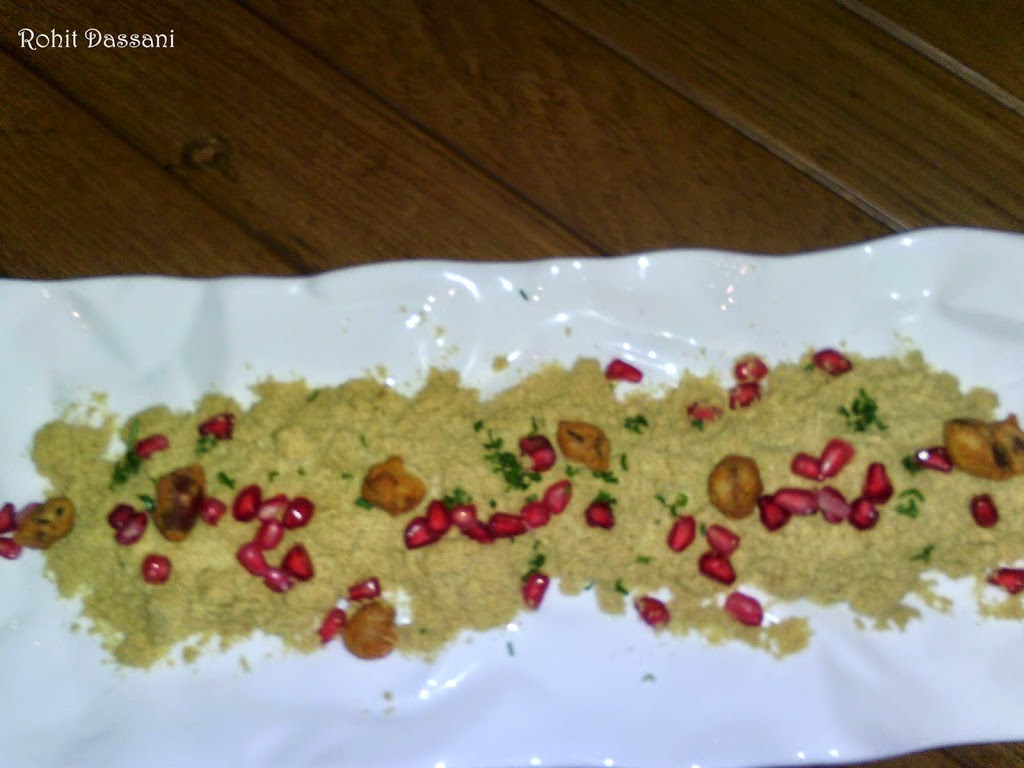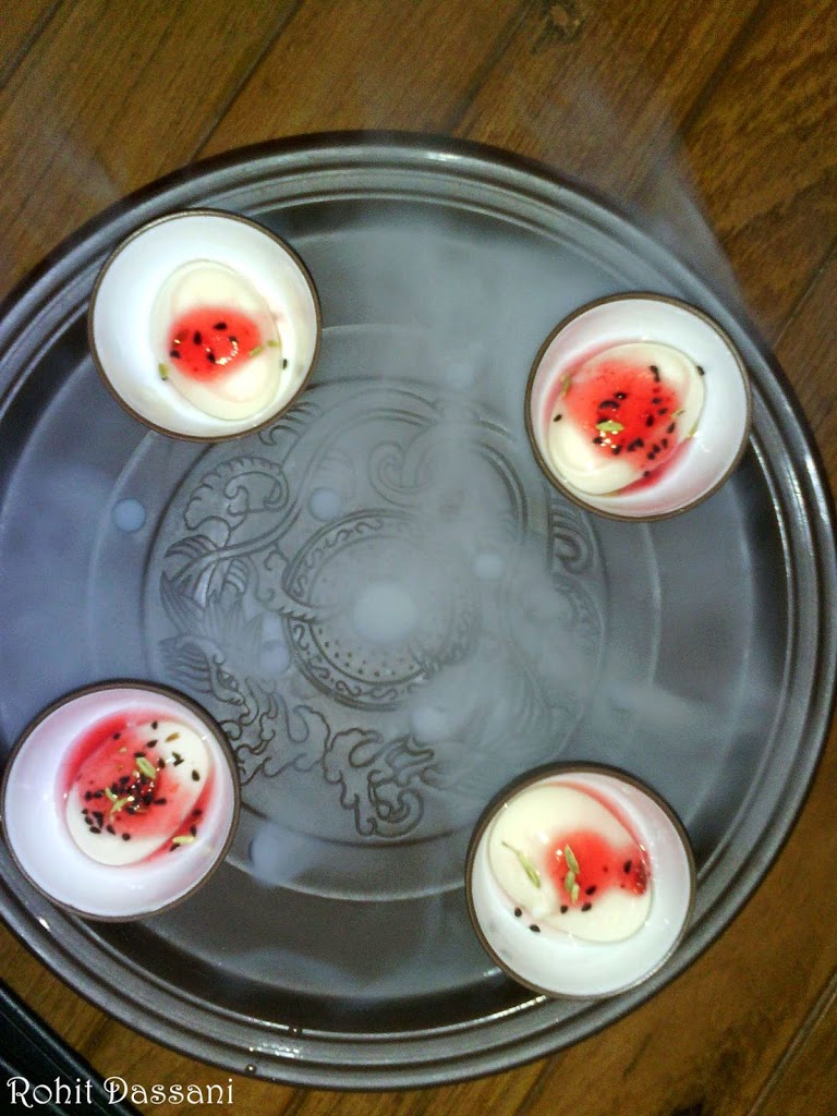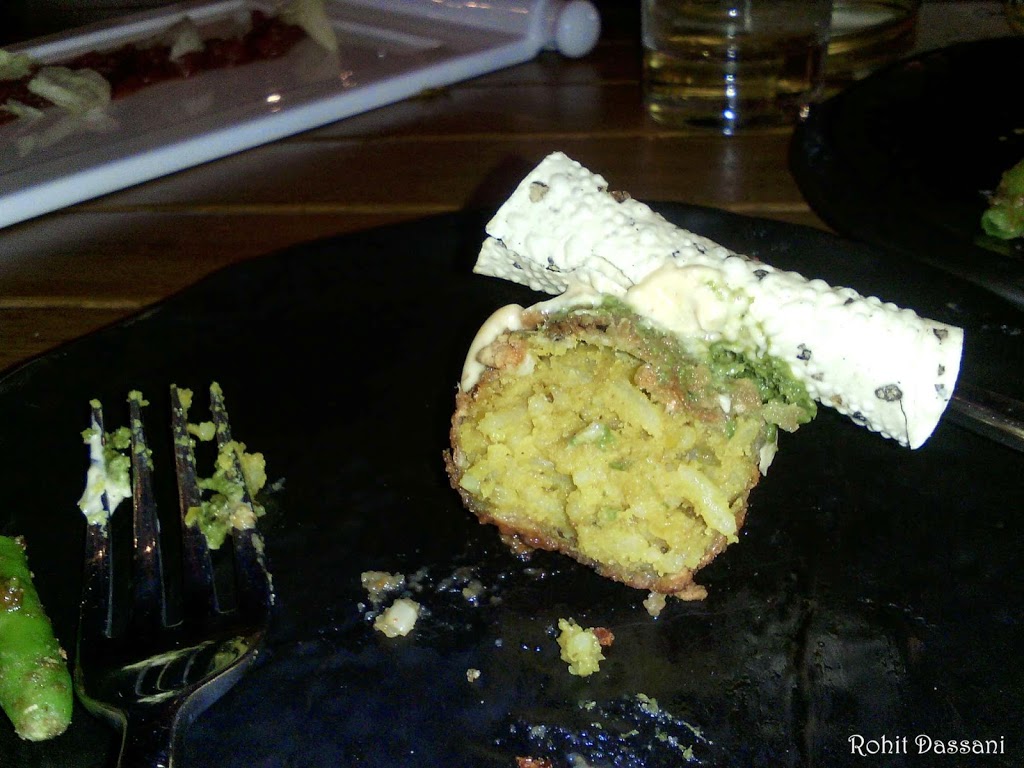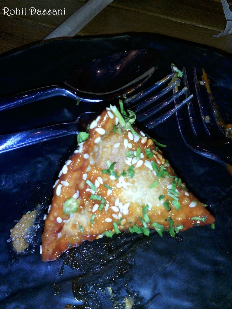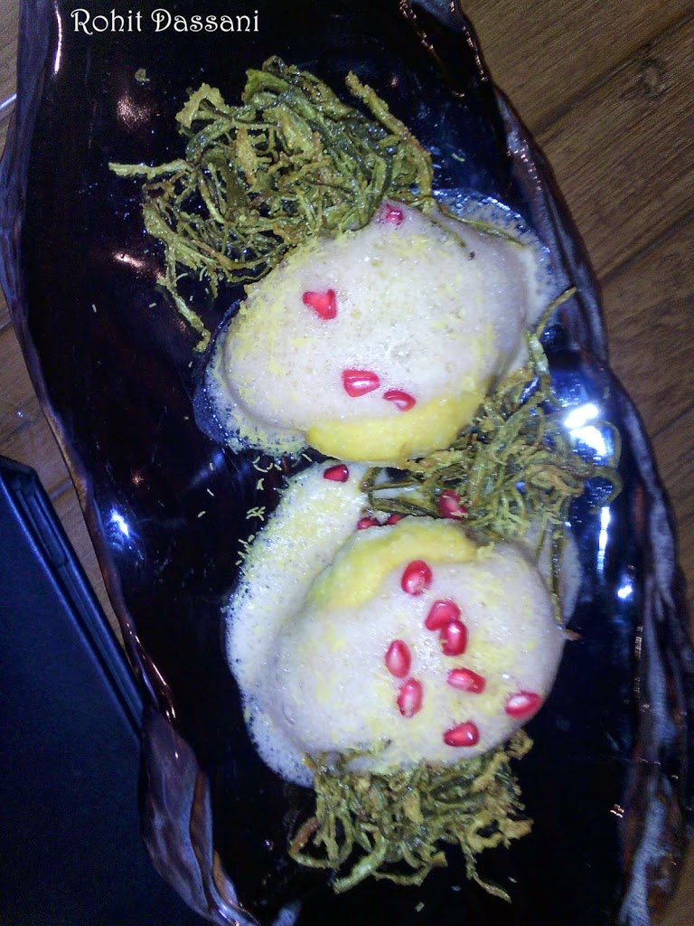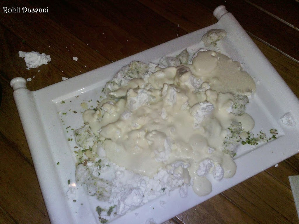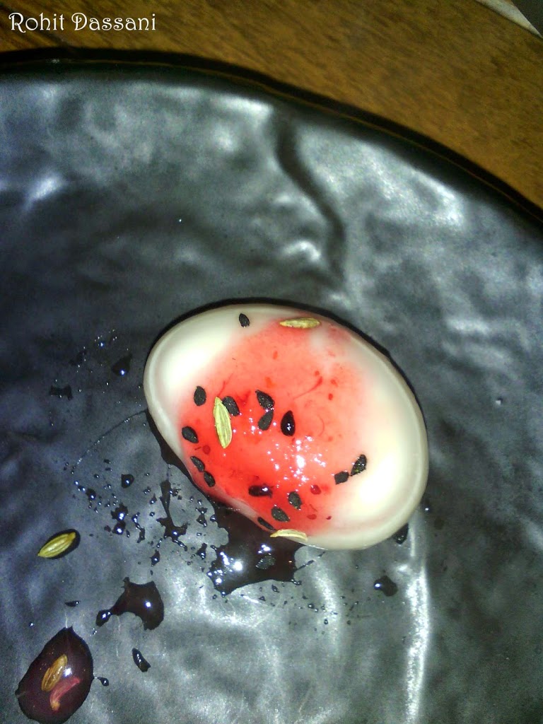 Next came the Bombay Bhel Version 2. The bhel was in the form of a powder, can you even imagine that. Nitrogen gas was pumped into the powder to give it a mystic look. The flavors’ of the bhel were intact even in the powdered form. But due to its powdered form the starchy bhel stick to the upper jaw. All in all, innovation at its best. Next came the Chinese Samosas topped with Sesame seeds. The outer layer was crisp and the stuffing was very flavorful.
