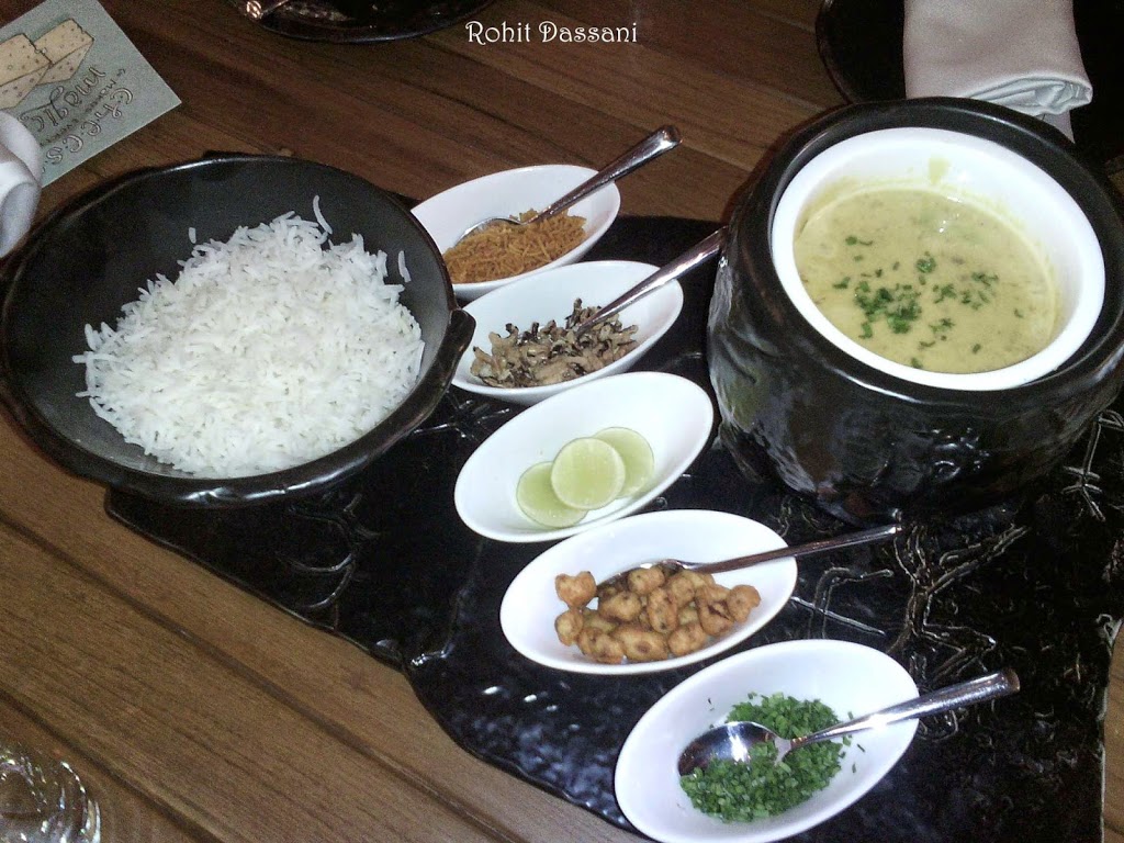 Then a ceramic tree shaped structure was placed on the table. The branches of the tree had Sorbet with a slight hint of Swad (yes the same toffee we had when we were kids) in the form of a lollipop tickled with a hint of chutney. This was an unusual experience.