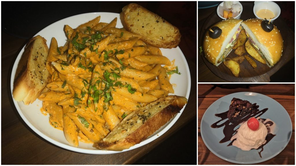 For the main course we tried their Makhani Penne Pasta Veg and the Veg Burger. The Pasta was made in a rich tomato makhana sauce. At first we were skeptical about it but it turned out to be decent. The Veg Burger was ok in taste and could have been better. Lastly, we tried their Chocolate Brownie with Icecream which was amazing in taste. The brownie had walnuts and was served with chocolate sauce on top!